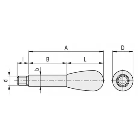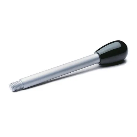 Braço alavanca com haste em aço carbono e manípulo em baquelite na cor preta. Fonte de imagens e desenhos técnicos: Elesa+Ganter.