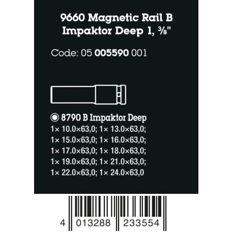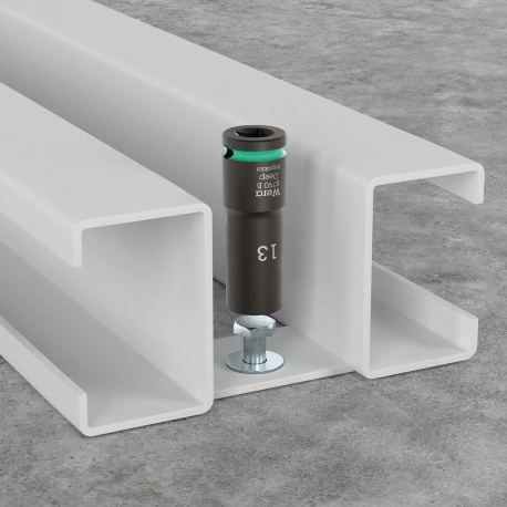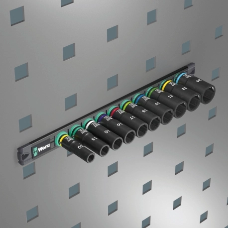 Trilho de soquetes com 10 soquetes Impaktor longos, 3/8". A tecnologia Impaktor garante uma vida útil acima da média, mesmo em condições extremas. Design longo para trabalhar mesmo em acoplamentos baixos e hastes roscadas salientes. O perfil hexagonal proporciona uma transmissão de altas forças e exerce menos pressão nas bordas do parafuso ou na cabeça do parafuso do que um perfil hexagonal duplo. Com o localizador de ferramentas Take it easy com codificação de cores por tamanho - para uma identificação rápida e fácil da ferramenta necessária. O trilho permite a fixação temporária em superfícies metálicas e, com sua função de destravamento por torção, garante o travamento e destravamento seguro dos soquetes.