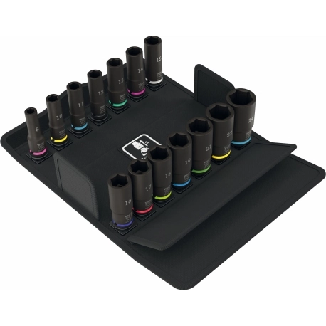 Conjunto com 14 chaves soquete Impaktor para uso com chaves elétricas ou pneumáticas com encaixe de 3/8". Design longo para acoplamentos baixos e hastes roscadas salientes. A tecnologia Impaktor garante uma vida útil acima da média, mesmo em condições extremas. O perfil hexagonal utilizado permite uma alta transmissão de potência, mantendo a precisão e protegendo o perfil. Com o localizador de ferramentas Take it easy, com codificação por cores por tamanho, para uma identificação rápida e fácil da ferramenta necessária.