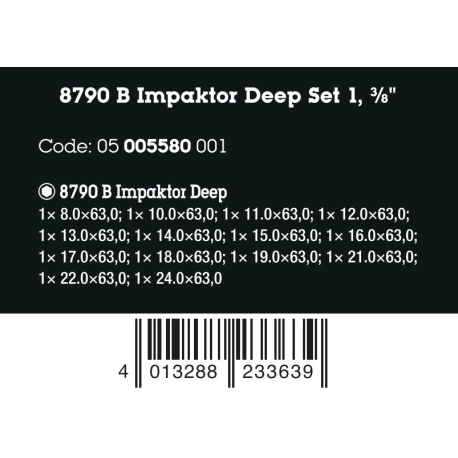 8790 B Impaktor Deep Set 1, 14 peçasPara chaves elétricas ou pneumáticasDesign longoTransmissão de potência com perfil amigávelFuro cruzado e soquete de anelFixação segura e fácil remoçãoSistema de busca de ferramentas Take it Easy